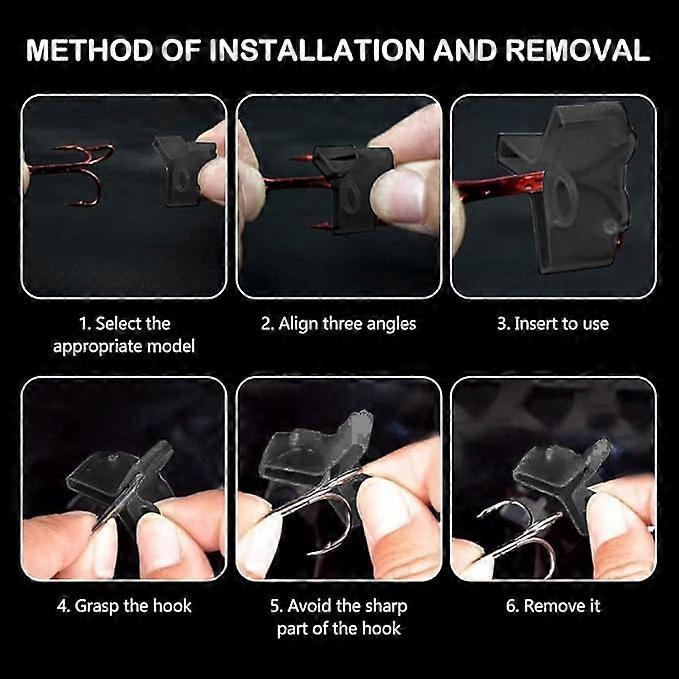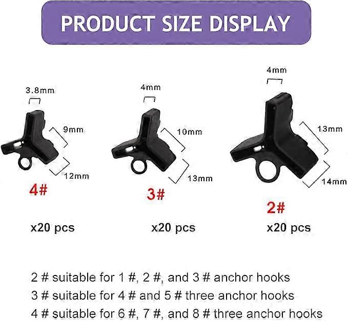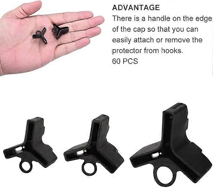 Package Contents: The package contains 60 fish hook covers, including 3 sizes: 2#, 3#, 4#, 20 pcs for each size. Sufficient quantity to meet your fishing needs. Not easy to fall off: This black cover with three hooks is made of polyethylene, which is lightweight but strong enough to prevent falling off. The empty groove allows you to keep the hooks dry and in good condition, durable. Function: Our fish hook cover can not only avoid the deformation of the fish hook, but also protect your fingers from being scratched by the fish hook, or prevent your clothes and interior decoration from being scratched. Easy to use: The small handle is located on the edge, which is convenient for installation and removal, easy to insert or pull out, and also convenient for storage. The groove can hold the hook stably. The groove design allows the hook to dry when the cover is opened to prevent corrosion Wide range of uses: The triple hook cover is very suitable for helping you clean the fish hooks, hang fishing lines, fishing rods and baits, providing you with a comfortable and thoughtful fishing experience, and is a perfect choice for fishing enthusiasts