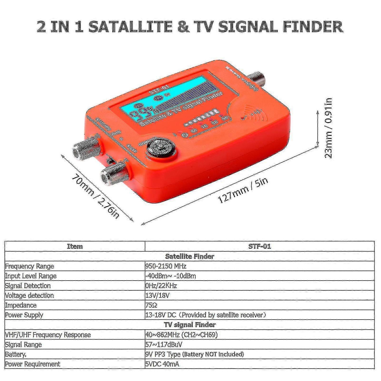 Satellit- og tv-signalfinderen er mikroprocessorstyret, hvilket gør den meget pålidelig og præcis. Signalstyrken vises grafisk på LCD-displayet i termometerskalaer og i tal (0~99%). Dens af kompakt størrelse og let vægt, meget praktisk at bruge. Features:2 i 1 satellit og TV signal finder er mikroprocessor styret, hvilket gør det meget pålidelig og præcis. Kompakt og let, nem at bruge. Digital LCD-skærm viser signalstyrken grafisk med baggrundsbelysning for at forbedre læseoplevelsen meget; Klar til at læse uanset om dagen eller om natten. Det er meget følsomt og kan registrere de svageste signaler; stærke indgående signaler (strøm fuld satellit, store paraboler, BVB-T-antenne, tv-antenne) kan let dæmpes for bedre aflæsning. Det kan også præsentere tonetoner på en summer; Jo højere tone, jo bedre signal. Humaniseret design med kompasfunktion til referenceformål. Bemærk: Størrelse og farve kan være lidt anderledes på grund af manuel måling og forskellige lysforhold. Tak for din forståelse. Specifikationer: Farve: OrangeMateriale: ABS - Satellite FinderFrekvens: 950 ~ 2150MHzEffekt: 13 ~ 18V DCInput Niveau: -40 ~ -10dBm - TV Signal FinderFrekvens: 40 ~ 862MHzEffekt: 9V DCInput Niveau: 57 ~ 117dBuVItem Størrelse: 127 * 70 * 28mm / 5 * 2,76 * 1,10inItem Vægt: 86g / 3,04ozPakke størrelse: 16,5 * 10,5 * 5,5cm / 6,50 * 4,13 * 2,17inPakke Vægt: 152g / 5,35ozPakke Liste:1 * Satellit-TV Signal Finder1 * Strømkabel1 * Brugervejledning (Engelsk)