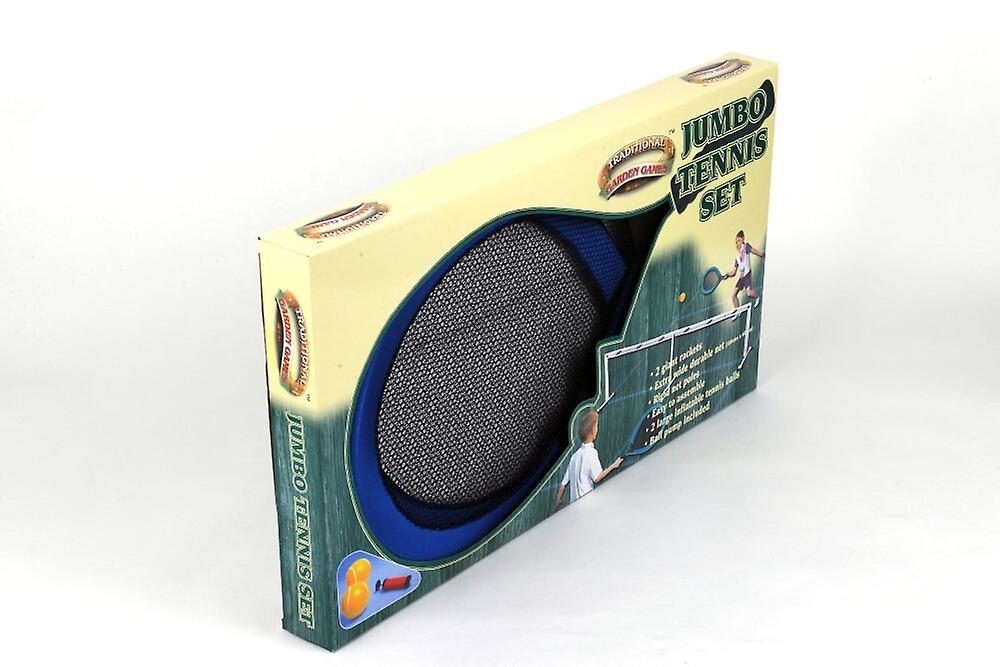 Traditional Garden Games Jumbo Garden Tennis is a giant fun tennis set. The jumbo sized racquets make it easy for children to practice and play. They cannot miss with these giant tennis racquets featuring a soft foam rim for safer play. Massive Fun Consists of two special Jumbo Tennis racquets, a tennis court net that is 300cm wide by 60cm high, a rigid support system for the net and two soft foam balls. raditional Garden Games Jumbo Garden Tennis Set Features:2 x Jumbo Tennis racquets with special soft handles (L 72cm x W37cm).1 x Tennis Net (L 300cm x H 60cm) with ridgid net poles.2 x Bouncy soft foam balls.Full instructions.