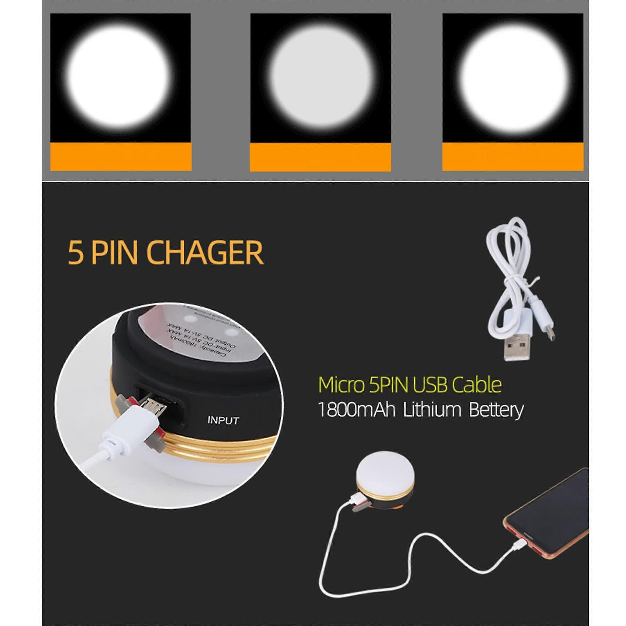 3 BelysningsmodusDet kan enkelt belyse hele teltet eller rommet om natten. Lav lysstyrkemodus (opptil 18 timers bruk), middels lysstyrkemodus (opptil 12 timers bruk), høy lysstyrkemodus (opptil 8 timers bruk). Ultra lys nøytral hvit, slik at denne lampen kan dekke dine spesielle behov i ulike scener. Bærbar og Brede applikasjoner Campinglys og lanterner størrelse er 70 * 49mm, vekten er 122g. Den er mini og bærbar, toppen har en innebygd magnet- og krokdesign, som kan adsorberes på metalloverflater og henges på telt, grener eller braketter. Frigjør hendene dine, det er veldig egnet for utendørs camping, eventyr eller nødbelysning. USB oppladbar Campinglykten er utstyrt med 5 LED-lys og et oppladbart batteri, det er veldig praktisk å bruke USB-kabelen til å lade. Og teltlyset er IP43 vanntett , men ikke dynk det i vannet. Power Bank DesignCampinglysene for telt er oppladbare og ladet med USB-kabel, samtidig kan den også brukes som en strømbank for å lade mobiltelefonen din i en nødsituasjon. Så det er det beste valget for deg når utendørs Camping. IP65 vannbestandig og BrannsikkerLaget av sterk plast og silikon, kvalifisert med IP65 sikkerhetsklasse. Vannavstøtende design og brannmotstand tåler hardt vær. Ingen bekymringer for lykten når det regner kraftig eller i brannen.