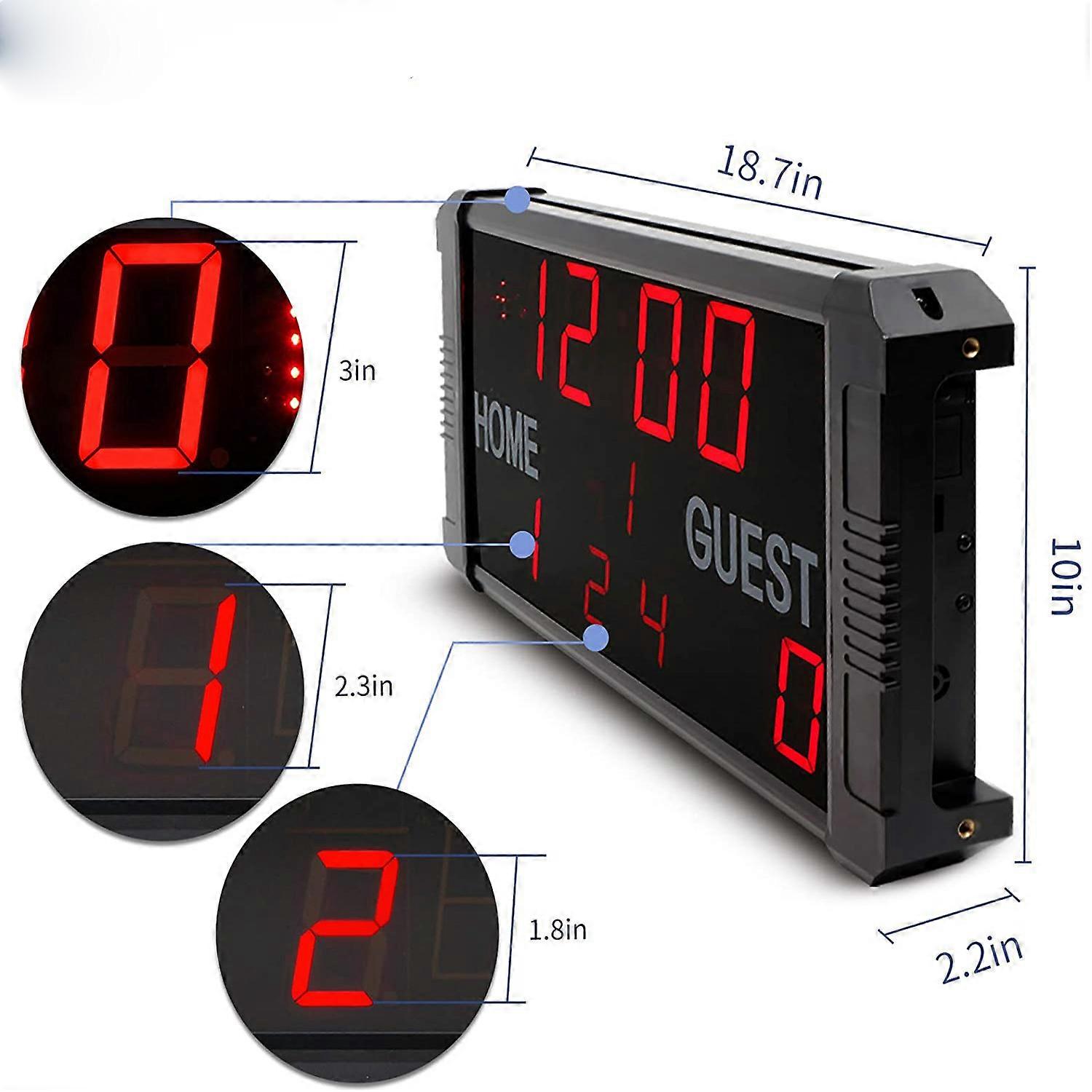 Vi skickar enligt den kostym du köpte när du gjorde din beställning. Fjärrkontroll Aluminium Bärbar Resultattavla Elektronisk Med 14 24 S Shot Clock för Basket Fotboll Storlek: 475 mm x 255 mm x 55 mm (18.7 x 10.1 x 2.17) siffrig höjd 3"+2.3" (7.62cm+5.84cm) Rammaterial : Aluminiumlegering Visuellt område 66ft(30 meter) Ljud: Med pipljud Kontrollmetod Fjärrkontroll och appkontroll Strömförsörjning : AC110 ~ 260V eller 12V DC ***Det finns två resultattavlalägen: (Du kan byta läge med fjärrkontrollen ) läge 1: Tid+Period+HEM+GÄST+Foul läge 2: Tid+Period+HEM+GÄST+24S skottklocka ***Denna resultattavla har också ytterligare 4 funktioner: räkna upp/nedräkning/stoppur/ 12/24 H klocka. Det hörs summerljud (decibel75DB). ***Denna resultattavla har två kontrollmetoder: fjärrkontroll och appkontroll. Det giltiga avståndet för fjärrkontrollen är cirka 45 meter; Det giltiga avståndet för appkontroll är cirka 15 meter. App kan användas med Android eller IOS. (Du kan ladda ner appen i google paly eller app store.) Ljusstyrkan är justerbar: 5 nivåer. Jämförelse ***Om du behöver både resultattavlan och stativstativet, välj Kostym B. ***Om du bara behöver resultattavlan, välj Kostym A. ***Om du bara behöver stativstativet, välj Suit C. Vi skickar enligt den kostym du köpte när du gjorde din beställning. ***Strömadapter: Vi kan erbjuda olika standard på kontakt: Amerikansk/europeisk/australiensisk/brittisk/kinesisk. Vänligen ge information om pluggstandardi köparens memo. Om inga särskilda krav finns det